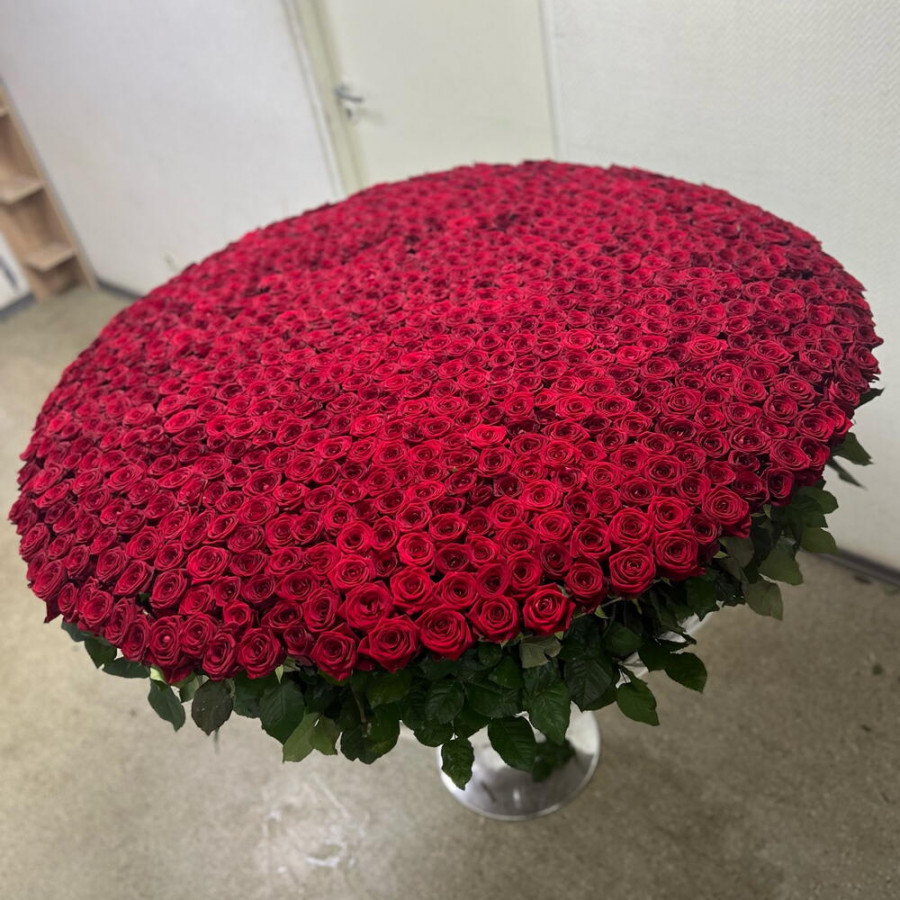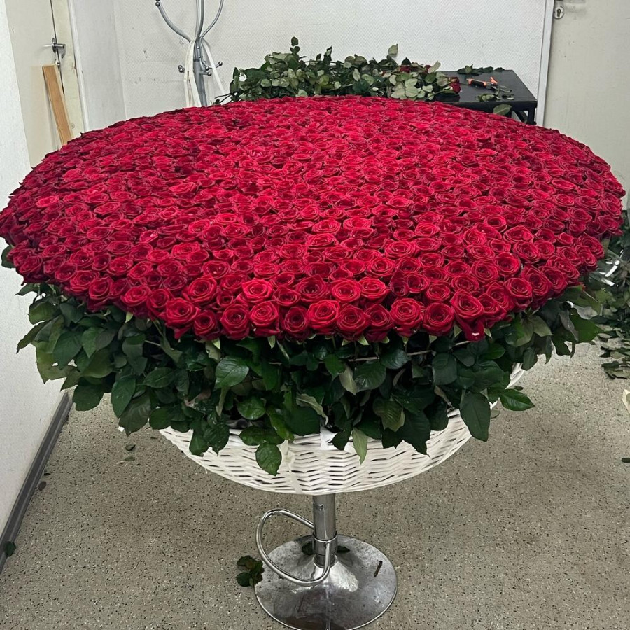 На фото букет из 1001 красной розы в корзине «величие». В составе: роза 1001 шт, корзина (xl) 1 шт, оазис флористический 15 шт, . Все цветы свежие и ароматные, букет красиво оформлен и отлично подходит для подарка. Доступна доставка цветов или самовывоз.
