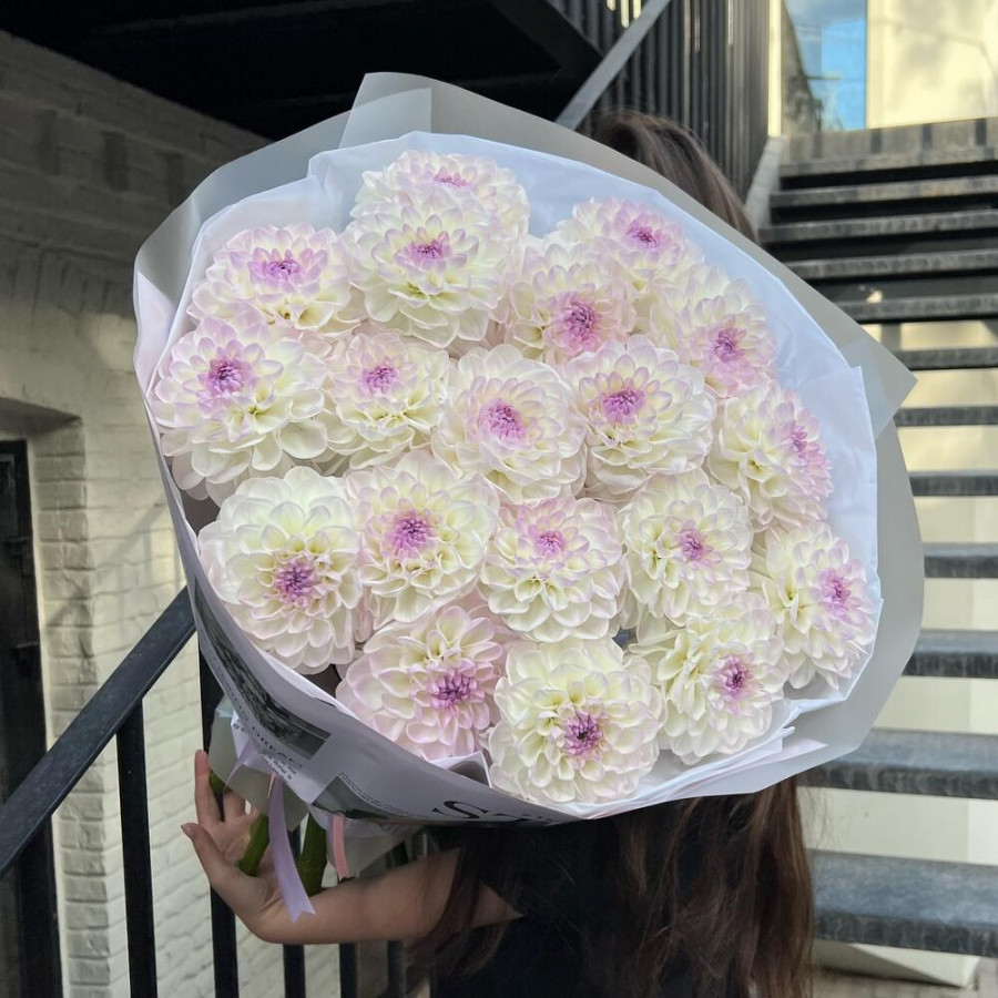 На фото букет из 19 бело-лиловых георгин. В составе: георгина 19 шт, дизайнерская упаковка 1 шт, атласная лента 1 шт, . Все цветы свежие и ароматные, букет красиво оформлен и отлично подходит для подарка. Доступна доставка цветов или самовывоз.