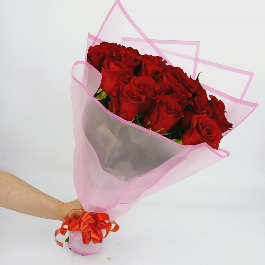 На фото букет из 21 бордовой розы. В составе: роза 21 шт, дизайнерская упаковка 1 шт, атласная лента 1 шт, . Все цветы свежие и ароматные, букет красиво оформлен и отлично подходит для подарка. Доступна доставка цветов или самовывоз.