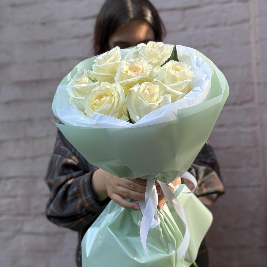 На фото 7 кремовых роз. В составе: роза 7 шт, дизайнерская упаковка 2 шт, атласная лента 1 шт, . Все цветы свежие и ароматные, букет красиво оформлен и отлично подходит для подарка. Доступна доставка цветов или самовывоз.