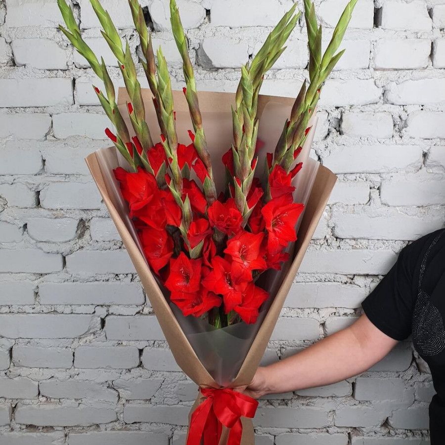 На фото букет 9 красных гладиолусов. В составе: гладиолус 9 шт, крафт-бумага 2 шт, атласная лента 1 шт, . Все цветы свежие и ароматные, букет красиво оформлен и отлично подходит для подарка. Доступна доставка цветов или самовывоз.